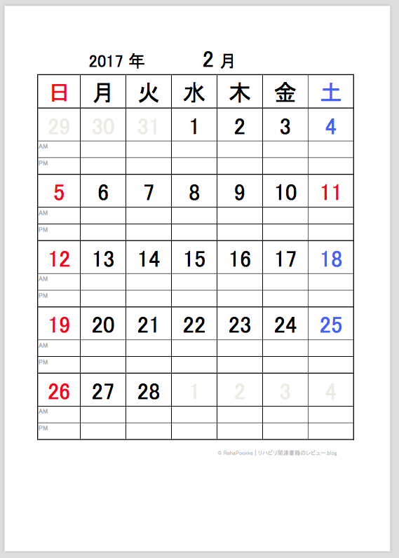 17 平成29 年2月カレンダー サンプル画像イメージ Rehapockke リハポッケ リハビリ専門家のポケット